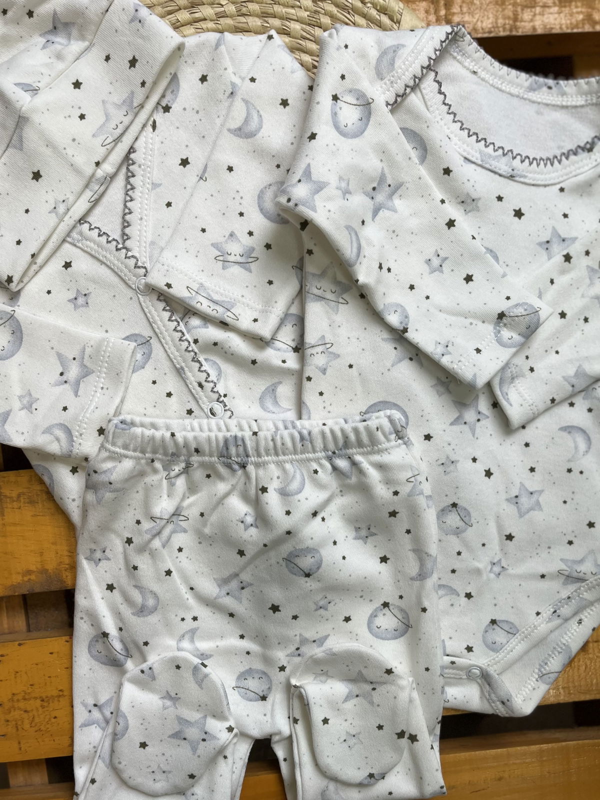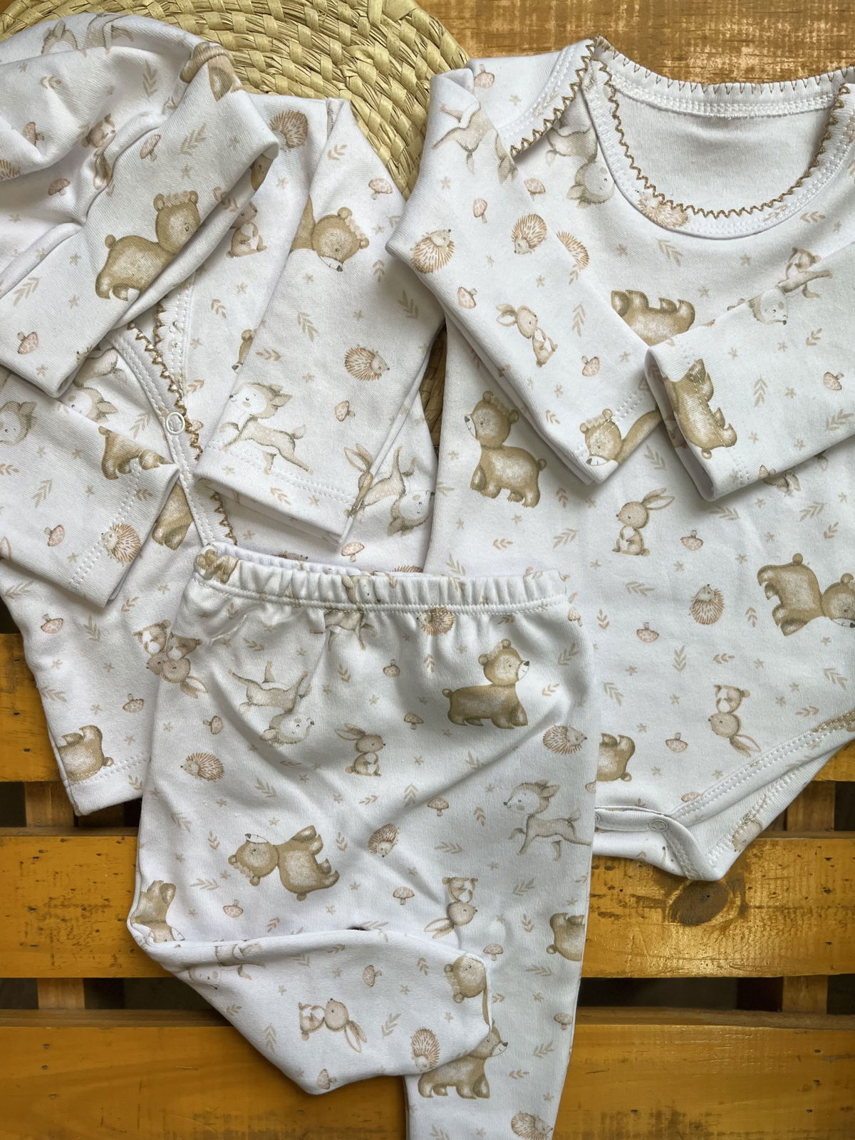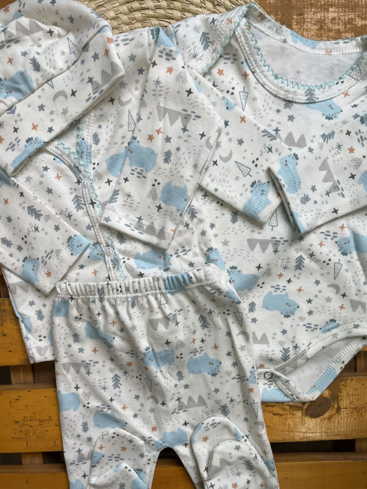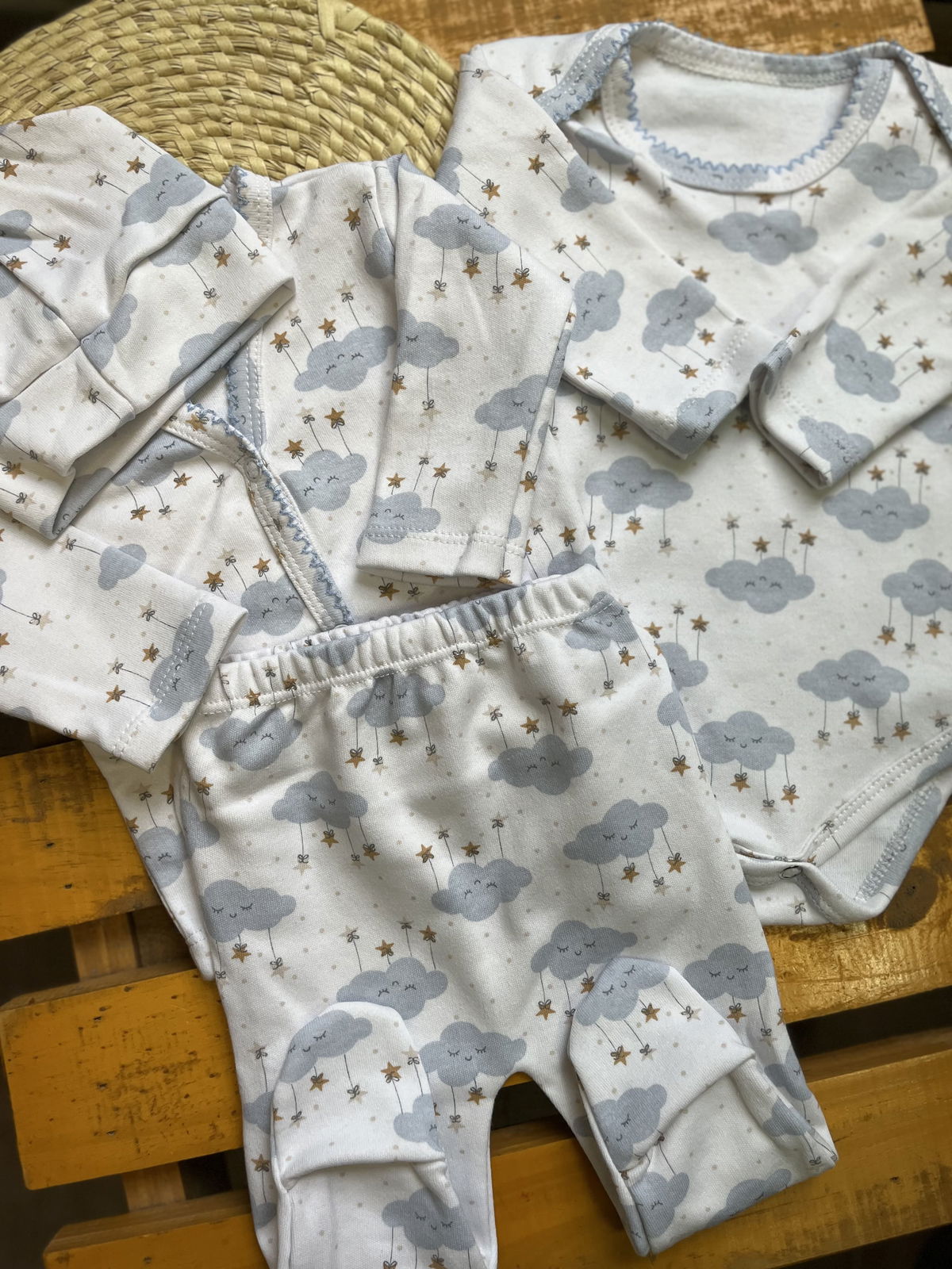 Ajuar de algodon recibidor 4 piezas: 1 body+ batita+ ranita + gorrito estampados delicados, combinados entre si , algodon suave ideal para recibir a tu bebé con ropita que cuide su piel delicada .