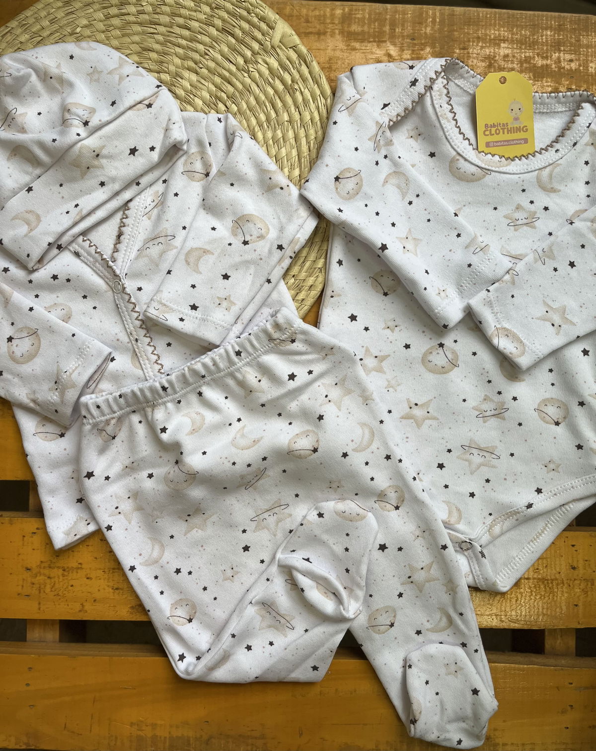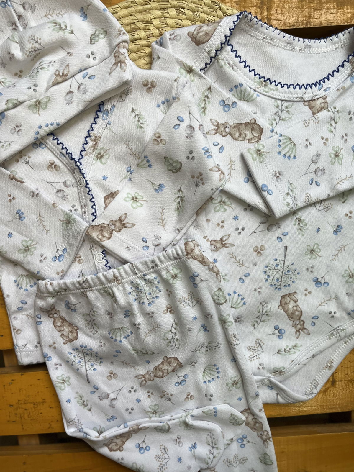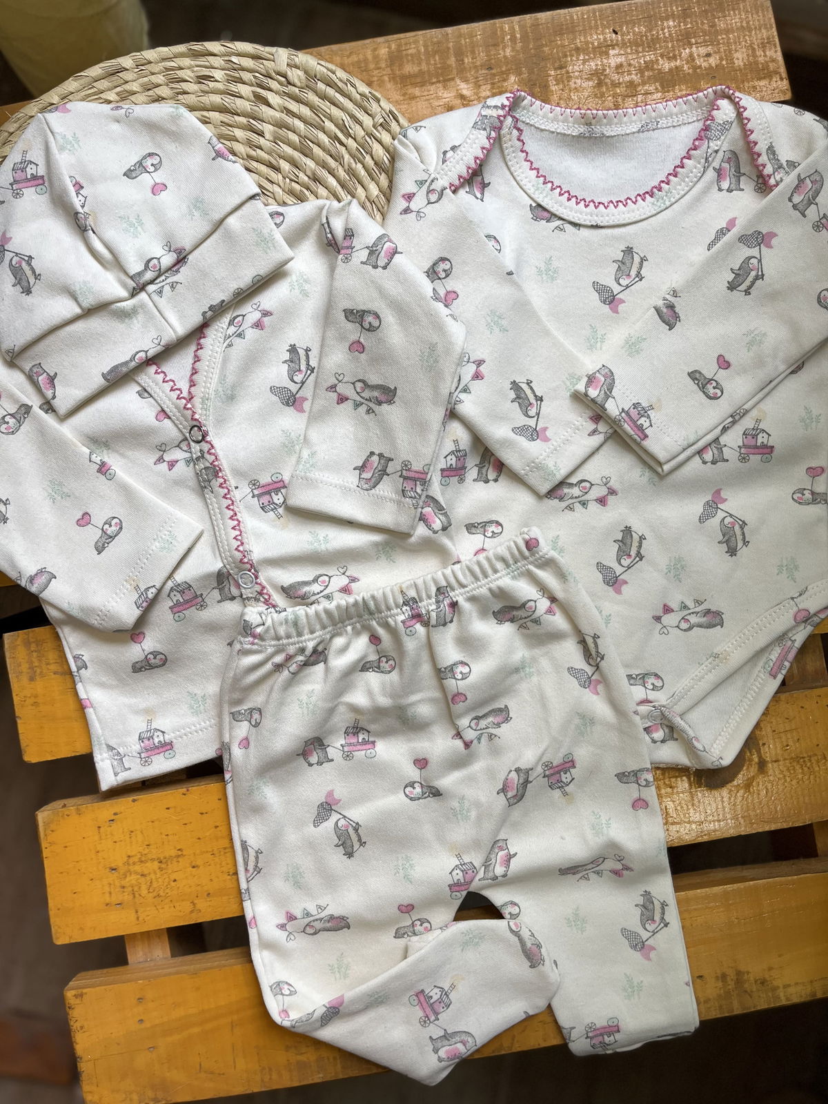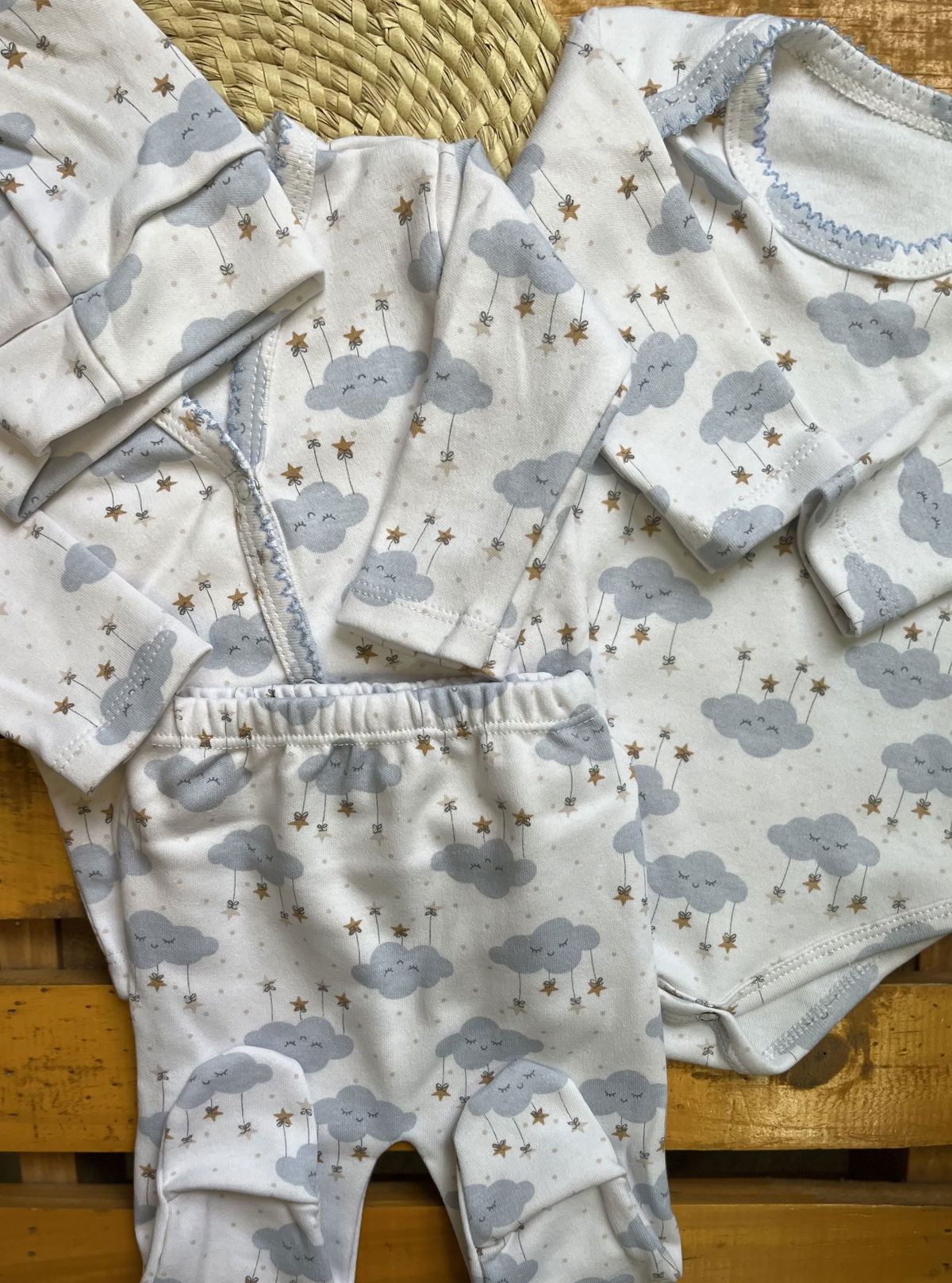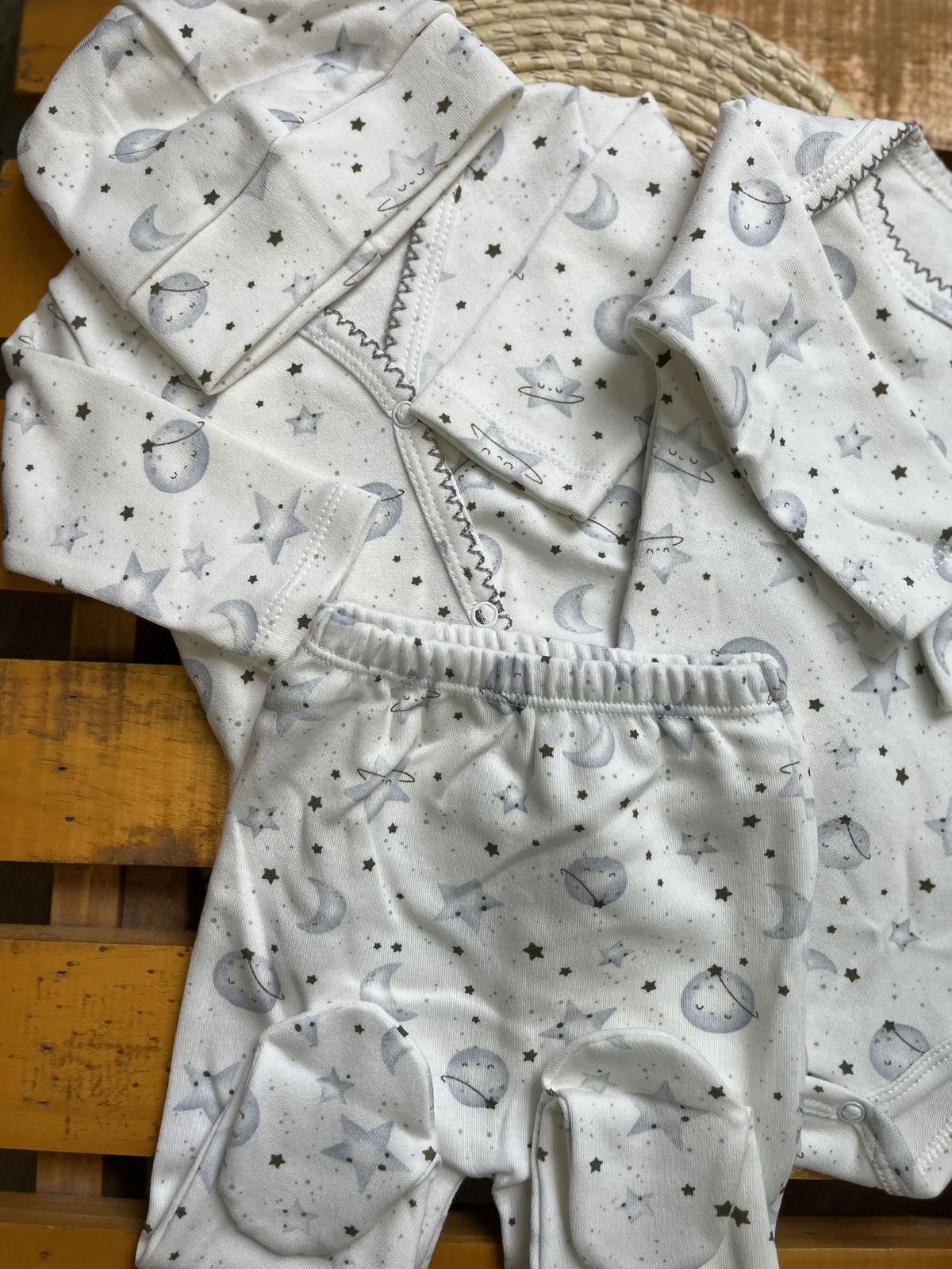 Ajuar de algodon recibidor 4 piezas: 1 body+ batita+ ranita + gorrito estampados delicados, combinados entre si , algodon suave ideal para recibir a tu bebé con ropita que cuide su piel delicada .