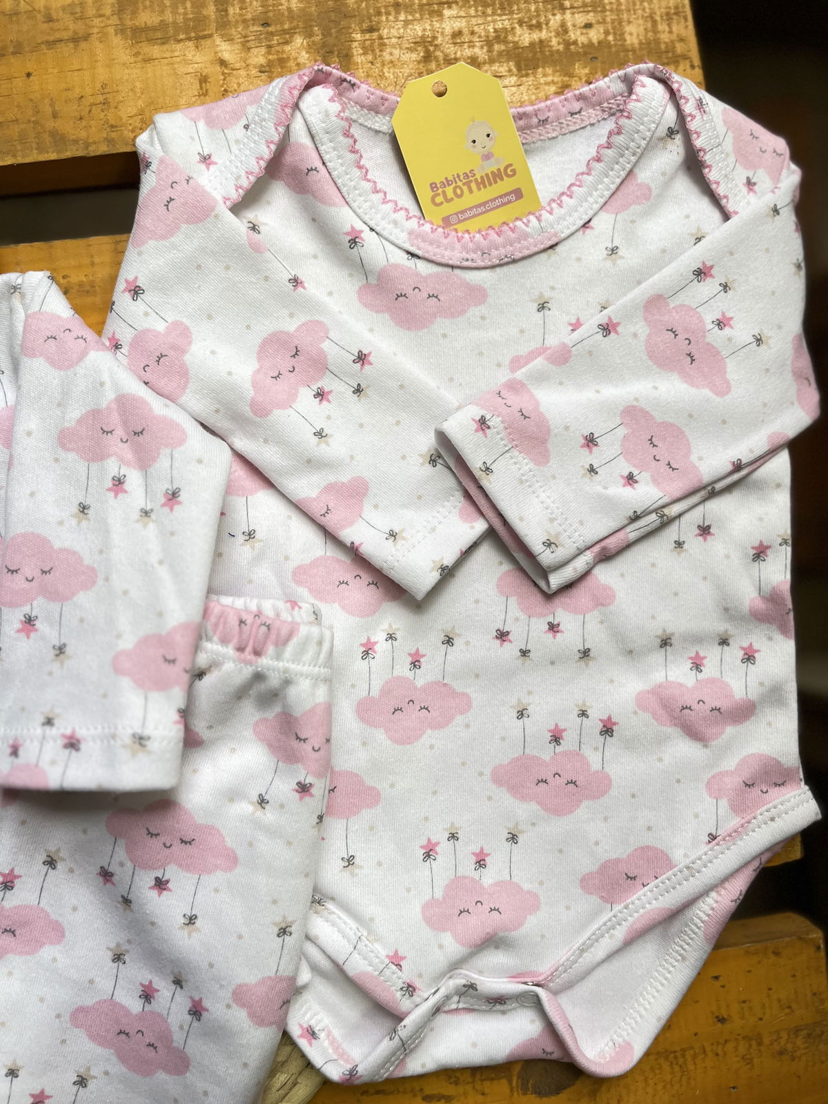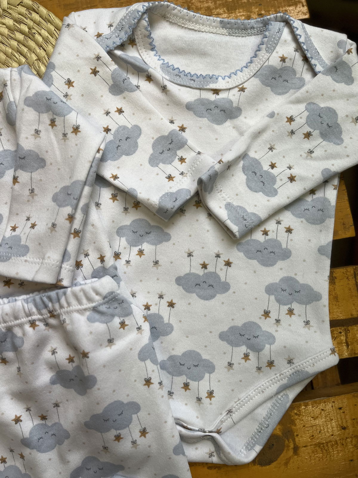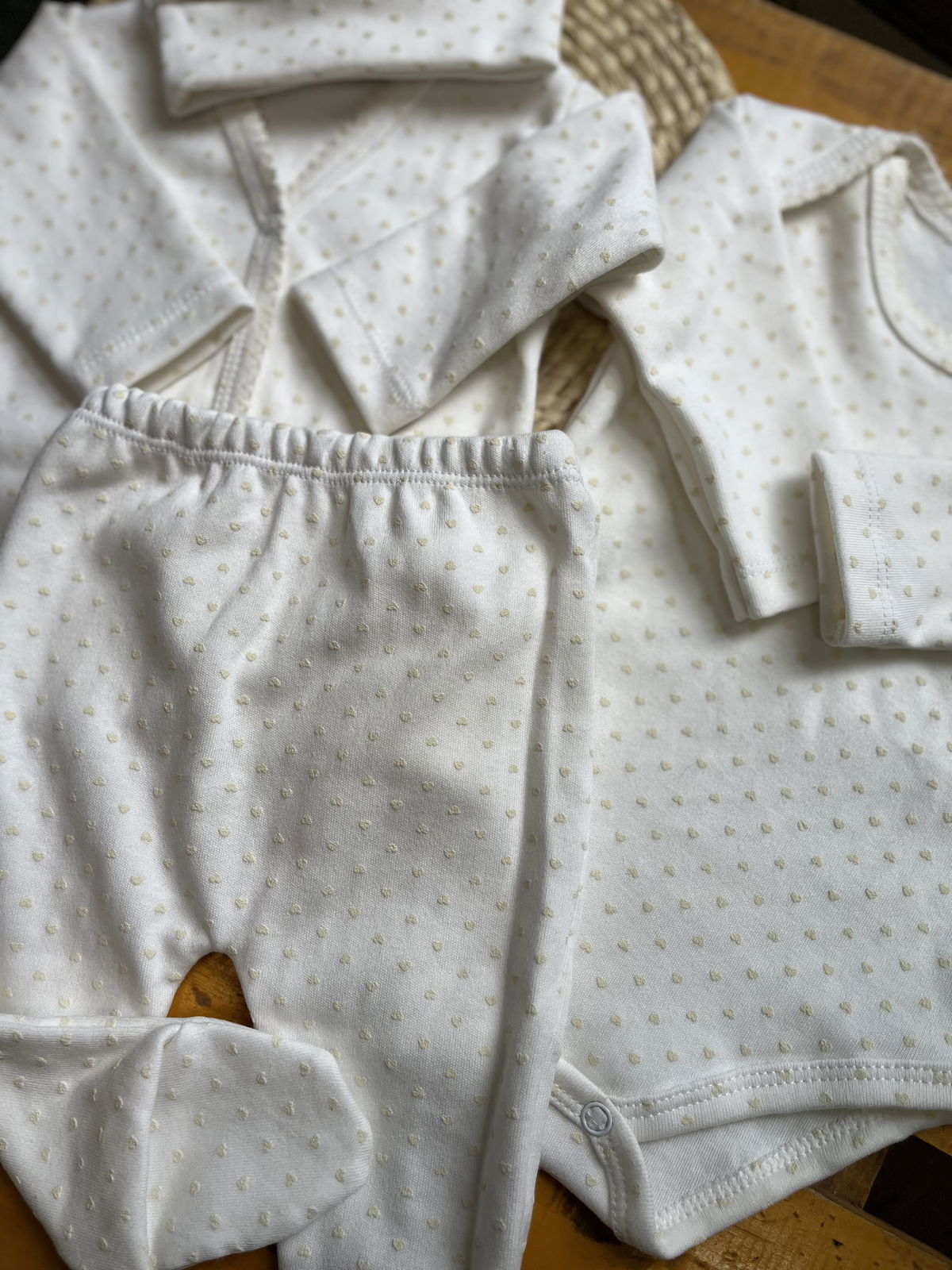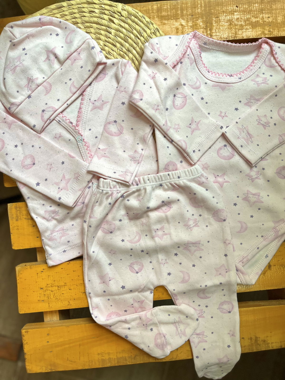 Ajuar de algodon recibidor 4 piezas: 1 body+ batita+ ranita + gorrito estampados delicados, combinados entre si , algodon suave ideal para recibir a tu bebé con ropita que cuide su piel delicada .