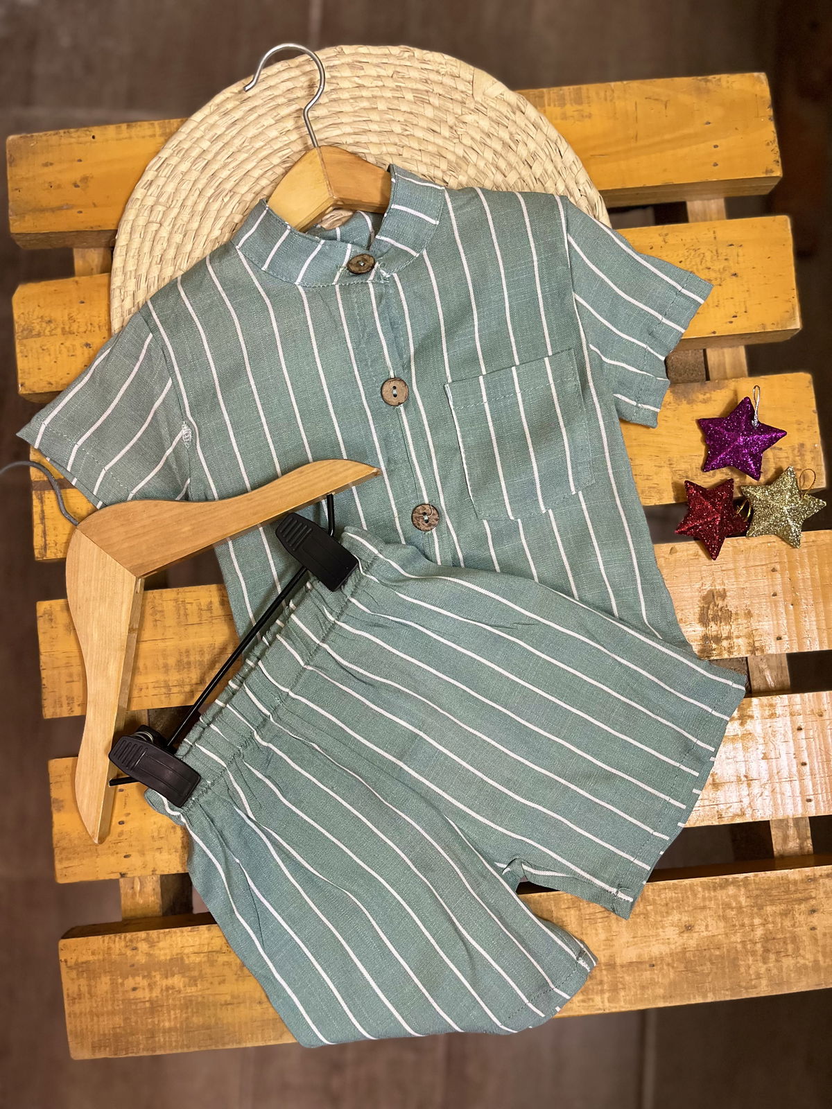 Conjunto de lino camisa cuello mao, botones de coco, short con elastico en cintura.